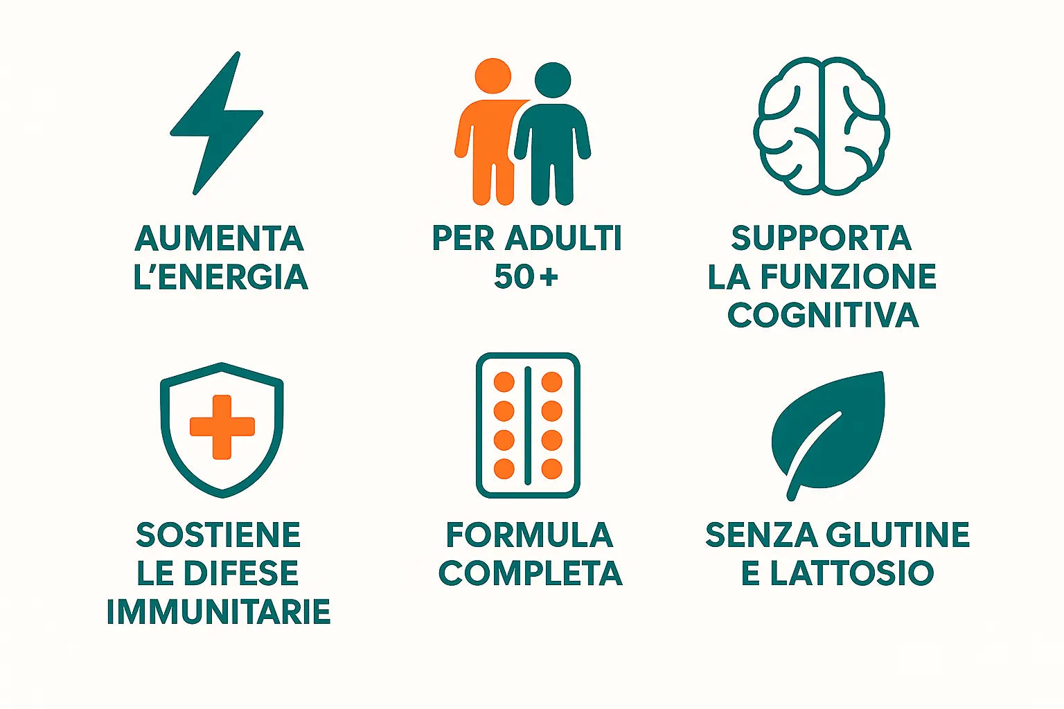 Scopri il ruolo attivo di ciascun ingrediente selezionato. Ogni componente è stato scelto per offrire benefici mirati al benessere di chi ha superato i 50 anni: